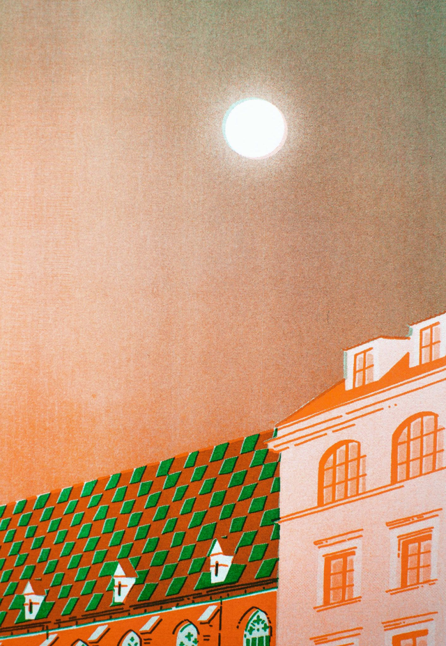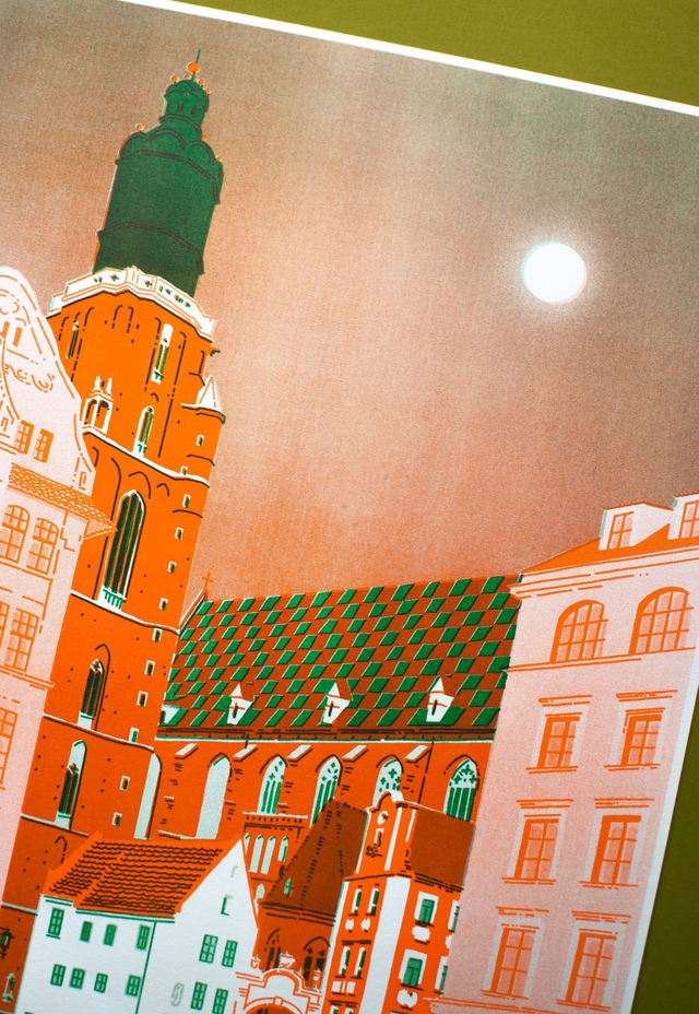 Pierwszy raz rysowałam ten widok na plenerze 11 lat temu. Dzisiaj wracam w to miejsce w grafice drukowanej w dwóch kolorach. Nie łatwo było oddać przestrzenność tego miejsca w tak ograniczonej technice, ale bez wyzwania nie ma funu. Chyba się udało.