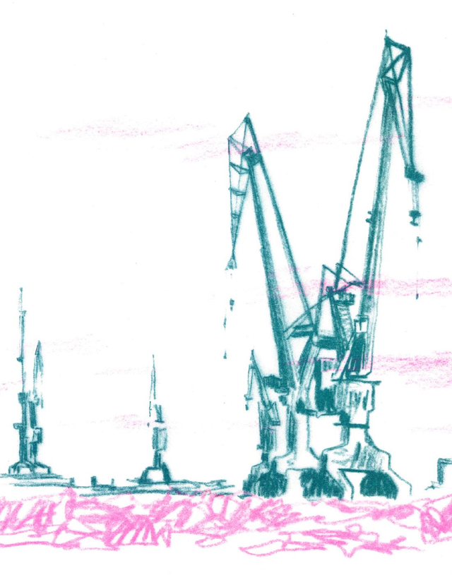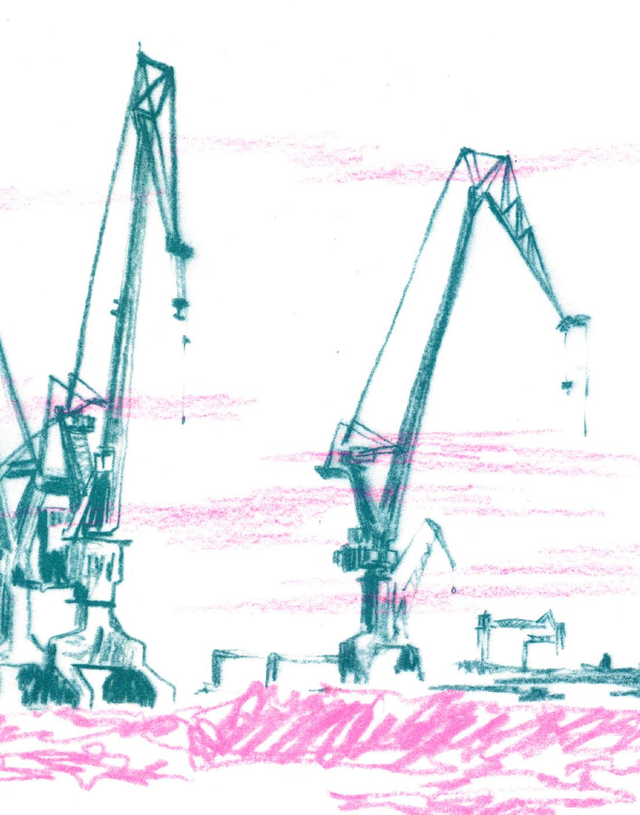 Niewiele jest w mieście rzeczy równie imponujących, jak wymykające się prostym formom dominanty wysokościowe. Zatem w moim kalendarzu obowiązkowo musiały zagościć czające się nad Stocznią Gdańską sępie sylwetki dźwigów. Udało mi się je uchwycić w lapidarnym stylu przywodzącym na myśl kreskę solidarycową, z czego jestem osobiście dumna.